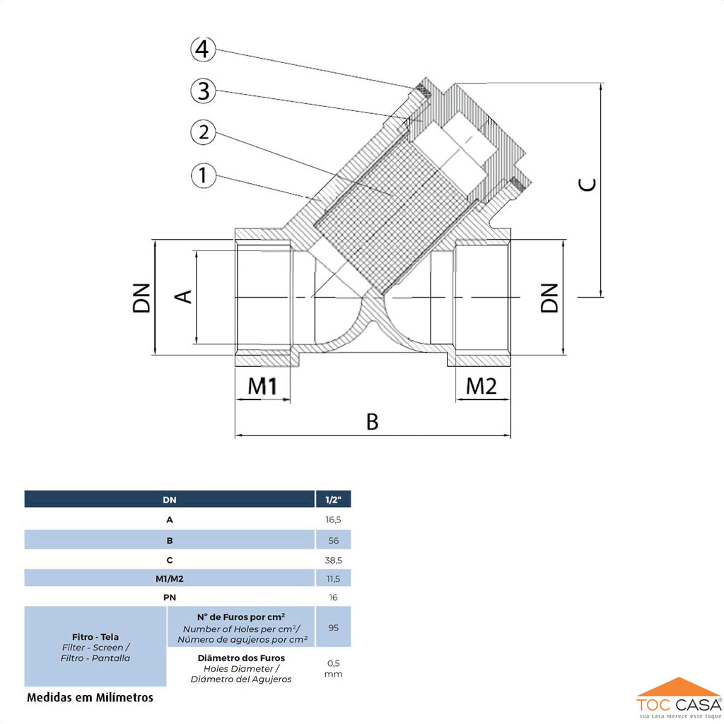 Fabricado em latão forjado e projetado para suportar até PN16 de pressão, este filtro é robusto e durável. Ideal para operações com temperaturas que variam de -15°C a +120°C.
