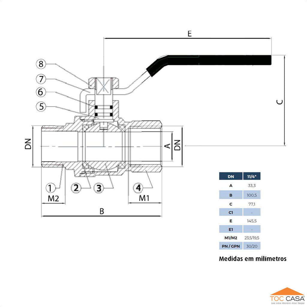 Válvula Esfera Macho x Fêmea 1.1/4 Gás Passagem Plena Alavanca IVM Italy Latão Niquelado GPN20 PN40